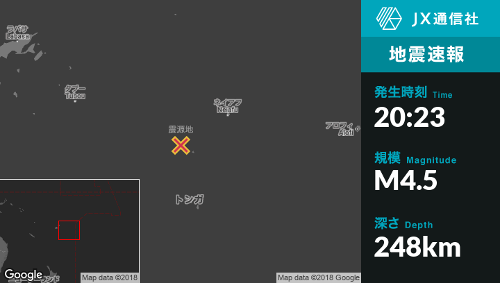 | 震源地 | トンガのPangaiから西北西124kmの地点 |