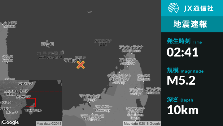 | 震源地 | マヨットのPamandziから東南東49kmの地点 |