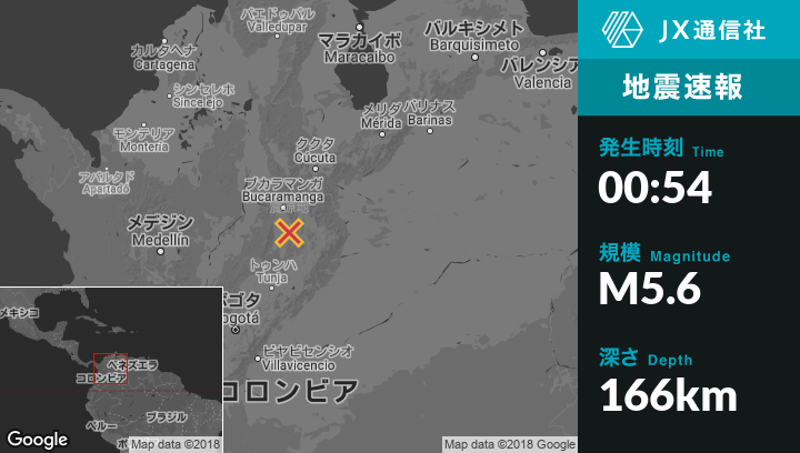 8月08日 00:54頃、コロンビアのAratocaから北7kmの地点でM5.6の地震がありました。