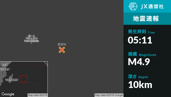 8月09日 05:11頃、モーリシャスのIle Rodriguesから東299kmの地点でM4.9の地震がありました。