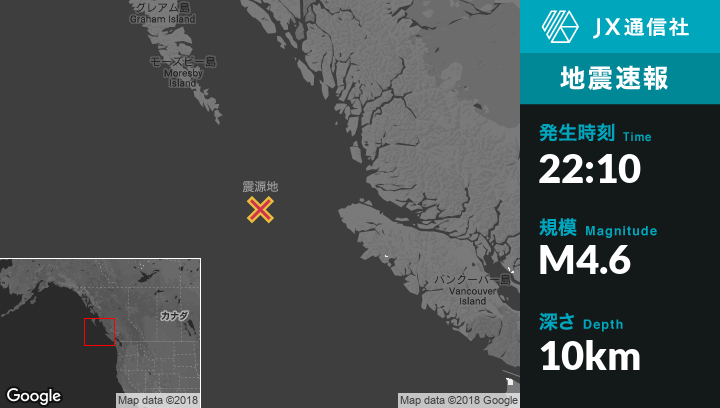 8月21日 22:10頃、カナダのPort Hardyから西191kmの地点でM4.6の地震がありました。