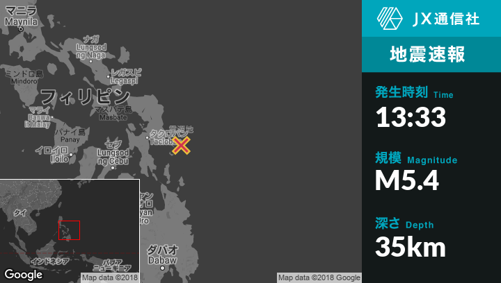 8月24日 13:33頃、フィリピンのSulanganから北東31kmの地点でM5.4の地震がありました。