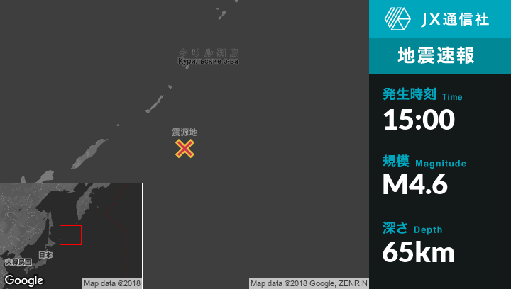 8月28日 15:00頃、ロシアのKuril'skから東北東405kmの地点でM4.6の地震がありました。