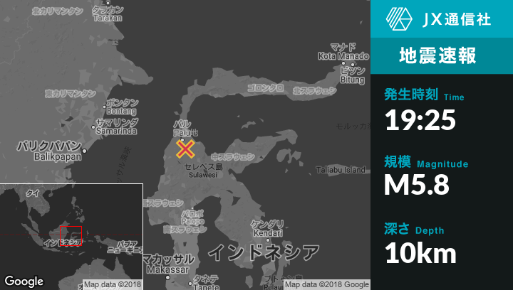 9月28日 19:25頃、インドネシアのPaluから南南東21kmの地点でM5.8の地震がありました。