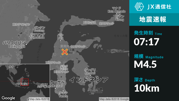 9月29日 07:17頃、インドネシアのPendoloから北西58kmの地点でM4.5の地震がありました。