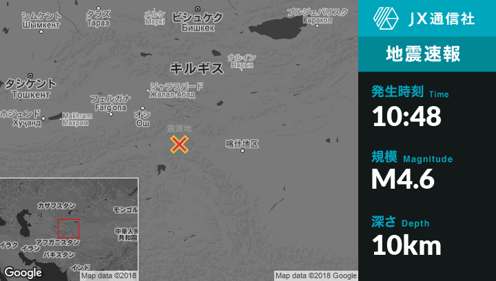 10月10日 10:48頃、キルギスのSary-Tashから東62kmの地点でM4.6の地震がありました。