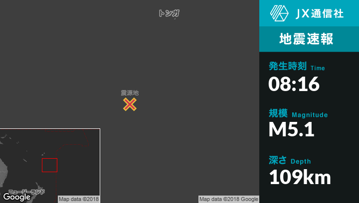 | 震源地 | トンガの`Ohonuaから南南西428kmの地点 |