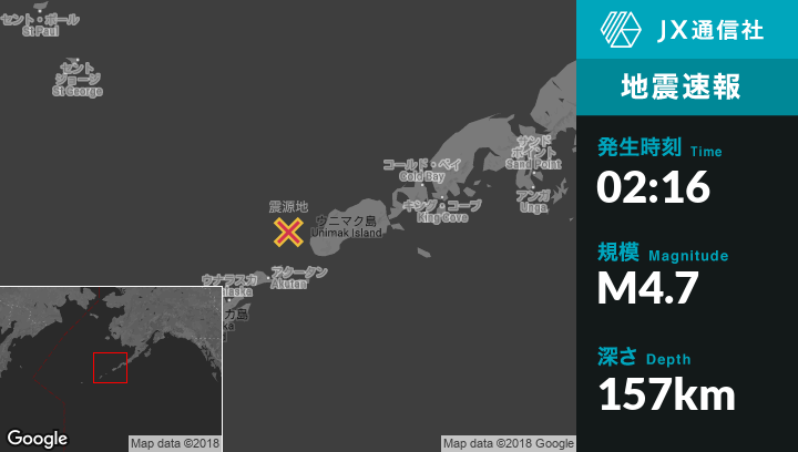 | 震源地 | アラスカのAkutanから北北東71kmの地点 |