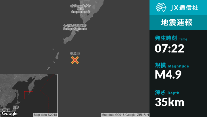 10月13日 07:22頃、ロシアのSevero-Kuril'skから南151kmの地点でM4.9の地震がありました。