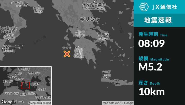 10月26日 08:09頃、ギリシャのLithakiaから南南西56kmの地点でM5.2の地震がありました。