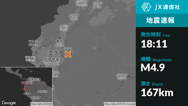 10月26日 18:11頃、エクアドルのPuyoから東21kmの地点でM4.9の地震がありました。