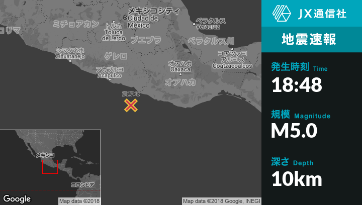 10月26日 18:48頃、メキシコのTecoanapaから南南西69kmの地点でM5.0の地震がありました。