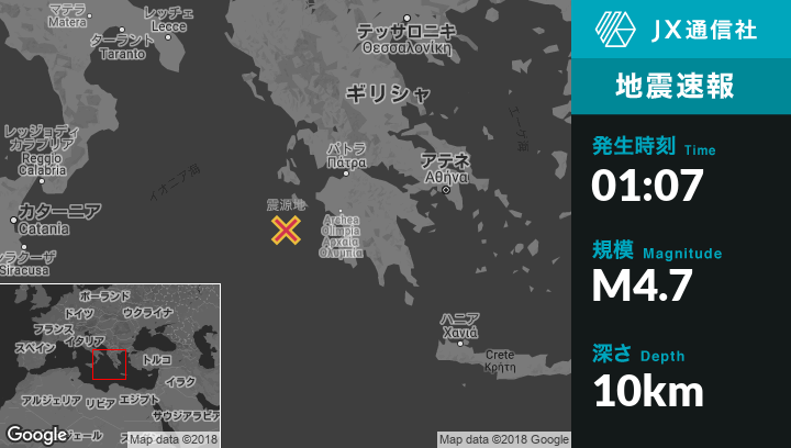 | 震源地 | ギリシャのMouzakiから南西40kmの地点 |