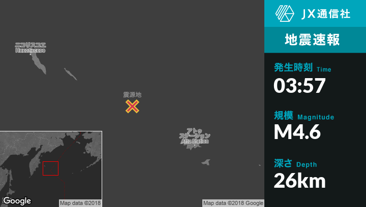10月27日 03:57頃、アラスカのAttu Stationから北西222kmの地点でM4.6の地震がありました。