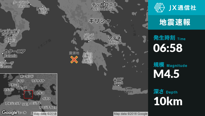 10月27日 06:58頃、ギリシャのLithakiaから南南西58kmの地点でM4.5の地震がありました。