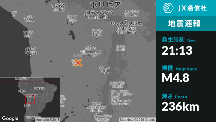 10月27日 21:13頃、ボリビアのUyuniから南東25kmの地点でM4.8の地震がありました。