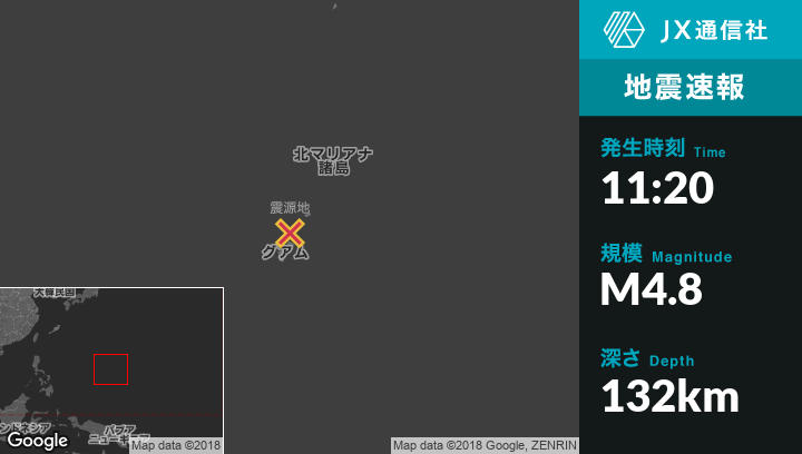 10月29日 11:20頃、グアムのYigo Villageから北41kmの地点でM4.8の地震がありました。
