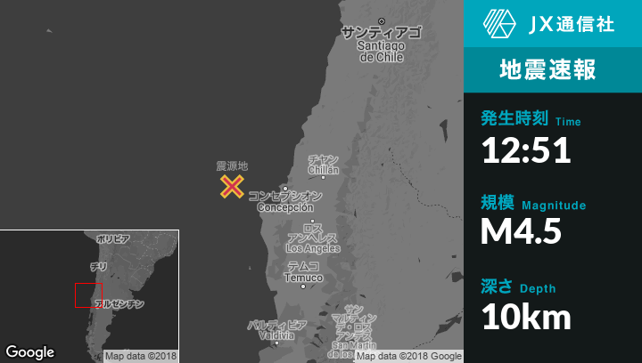 10月29日 12:51頃、チリのTalcahuanoから西110kmの地点でM4.5の地震がありました。