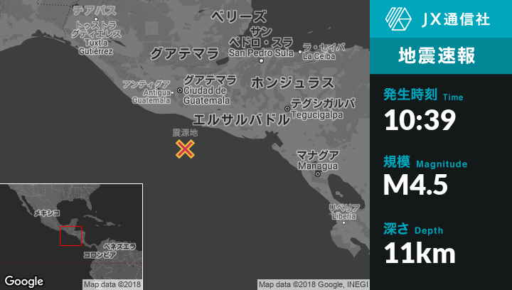 11月27日 10:39頃、エルサルバドルのAcajutlaから南西87kmの地点でM4.5の地震がありました。