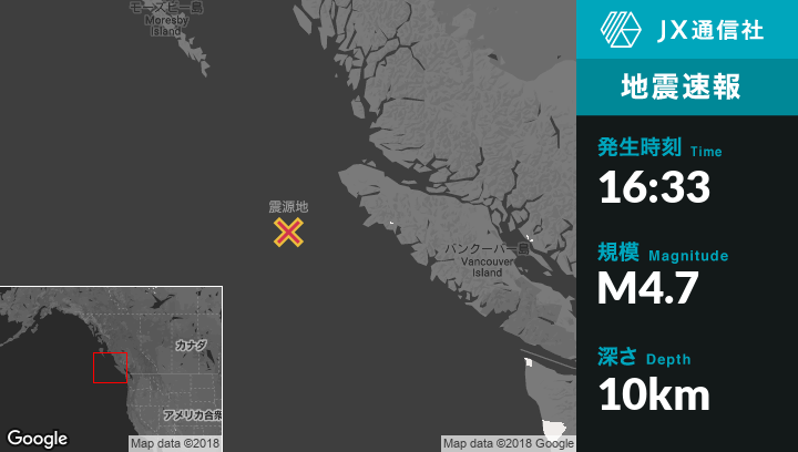 12月01日 16:33頃、カナダのPort Hardyから西南西156kmの地点でM4.7の地震がありました。