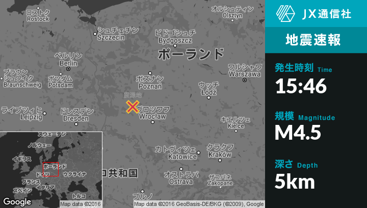 12月16日 15:46頃、ポーランドのGrebociceから南0kmの地点でM4.5の地震がありました。
