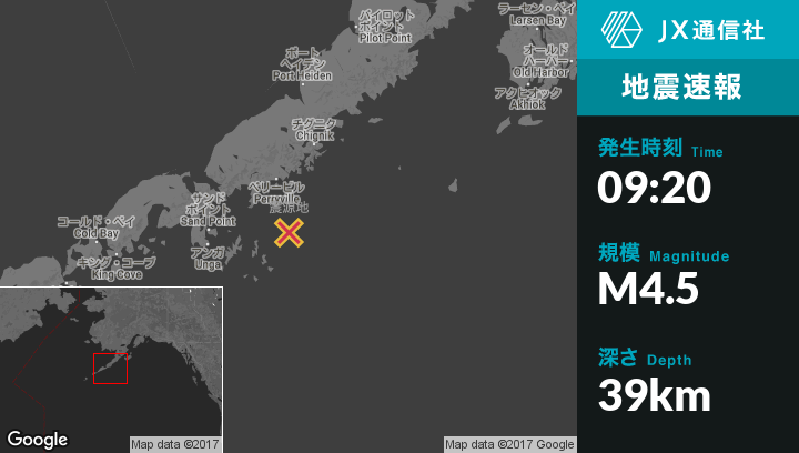 | 震源地 | アラスカのChernabura Islandから北北東77kmの地点 |