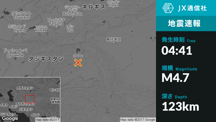 6月22日 04:41頃、タジキスタンのMurghobから西北西58kmの地点でM4.7の地震がありました。