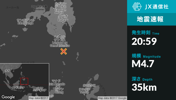 | 震源地 | フィリピンのSaranganiから南74kmの地点 |