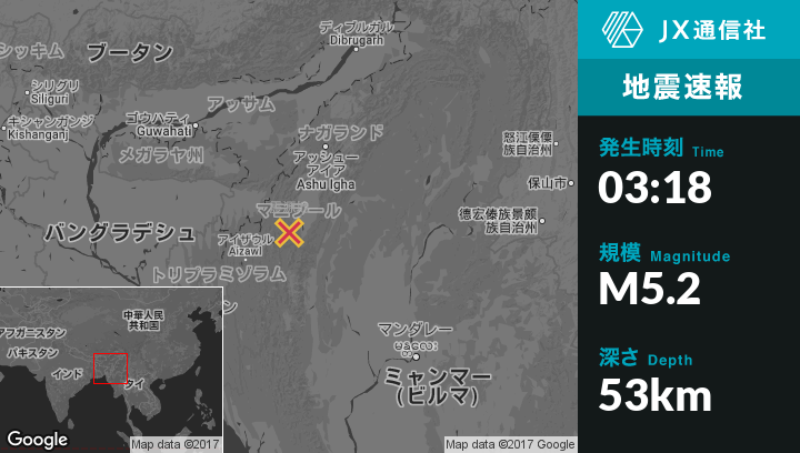 8月03日 03:18頃、インドのChurachandpurから西8kmの地点でM5.2の地震がありました。