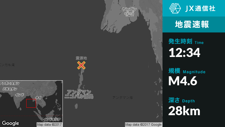 8月11日 12:34頃、インドのBamboo Flatから北215kmの地点でM4.6の地震がありました。