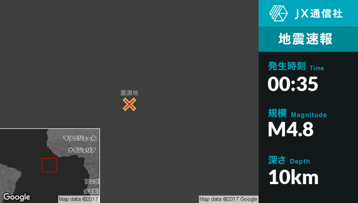8月19日 00:35頃、セントヘレナのGeorgetownから北730kmの地点でM4.8の地震がありました。