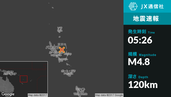 8月29日 05:26頃、バヌアツのLuganvilleから東北東63kmの地点でM4.8の地震がありました。