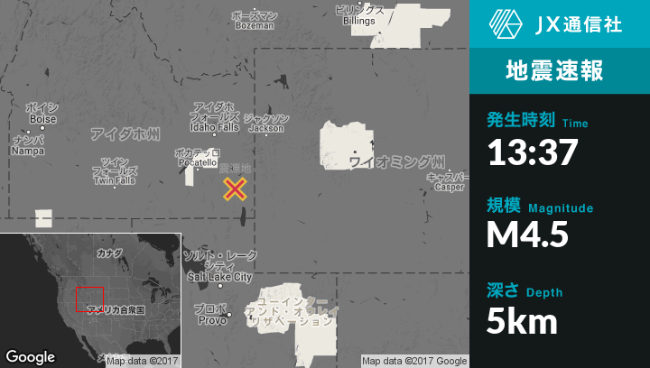 9月06日 13:37頃、アイダホ州のSoda Springsから南東8kmの地点でM4.5の地震がありました。