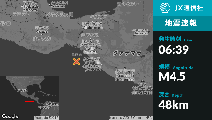 9月09日 06:39頃、メキシコのParedonから南南西95kmの地点でM4.5の地震がありました。