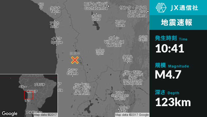 10月09日 10:41頃、チリのCalamaから北140kmの地点でM4.7の地震がありました。