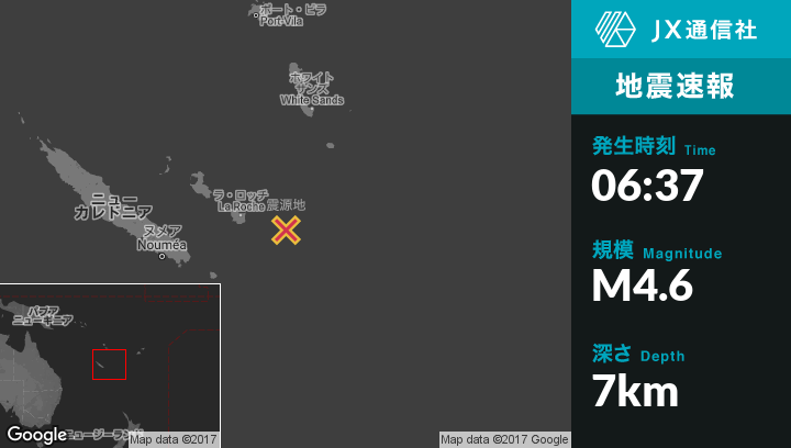 | 震源地 | ニューカレドニアのTadineから東108kmの地点 |
