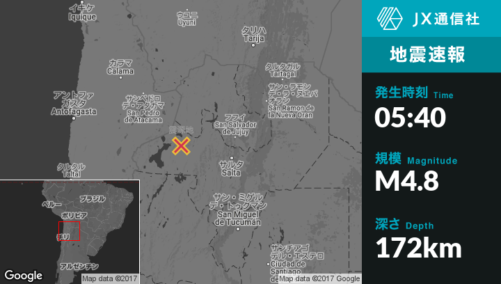| 震源地 | アルゼンチンのSan Antonio de los Cobresから西72kmの地点 |