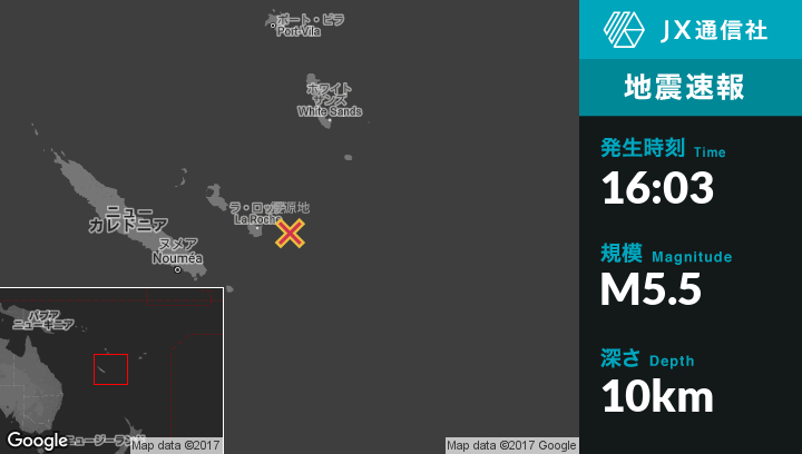11月16日 16:03頃、ニューカレドニアのTadineから東81kmの地点でM5.5の地震がありました。