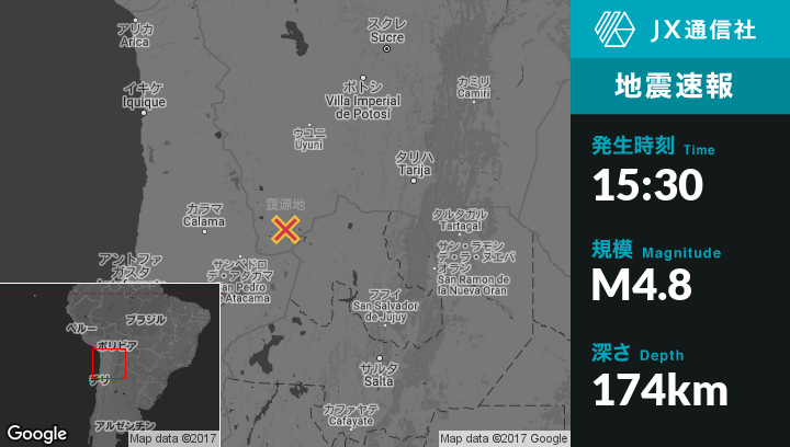 | 震源地 | チリのSan Pedro de Atacamaから北東114kmの地点 |