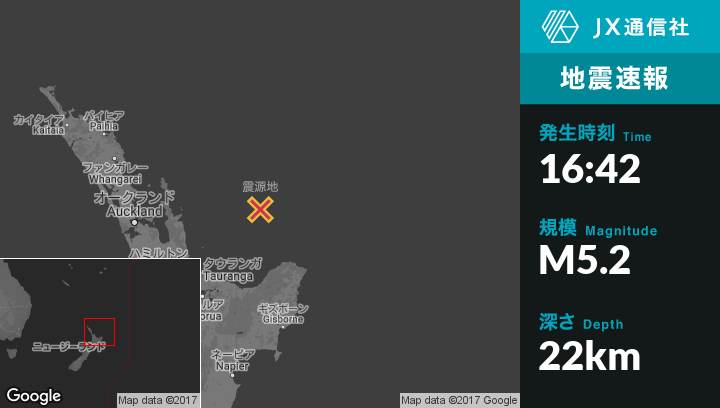 11月22日 16:42頃、ニュージーランドのTairuaから東北東158kmの地点でM5.2の地震がありました。