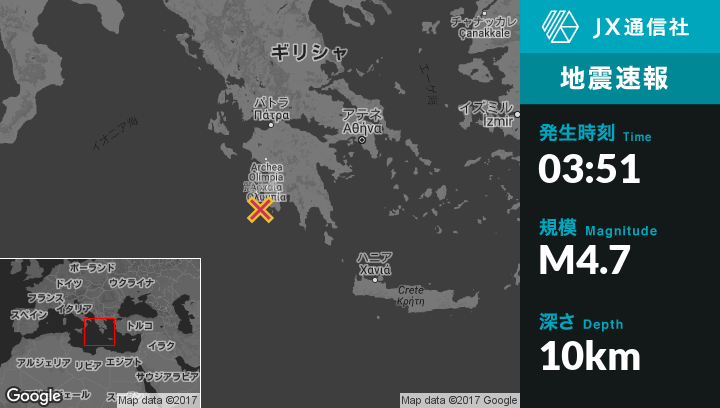 11月25日 03:51頃、ギリシャのPylosから西南西20kmの地点でM4.7の地震がありました。