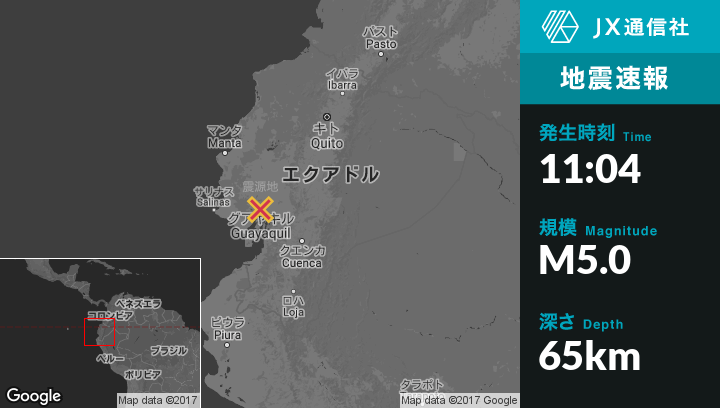 11月28日 11:04頃、エクアドルのGuayaquilから北北西9kmの地点でM5.0の地震がありました。