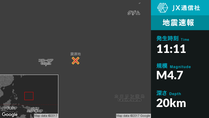 12月08日 11:11頃、ミクロネシアのFaisから北北西32kmの地点でM4.7の地震がありました。
