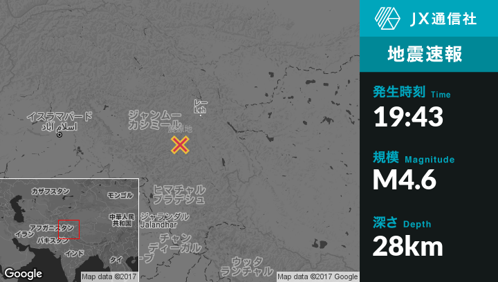 12月09日 19:43頃、インドのLehから南西98kmの地点でM4.6の地震がありました。