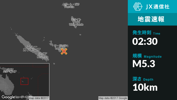 | 震源地 | ニューカレドニアのTadineから東49kmの地点 |