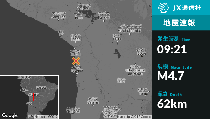 12月11日 09:21頃、チリのAricaから南85kmの地点でM4.7の地震がありました。