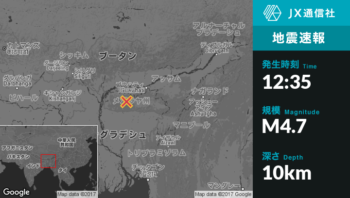 | 震源地 | インドのNongstoinから西北西47kmの地点 |