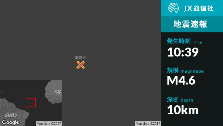 | 震源地 | ブラジルのFernando de Noronha (Distrito Estadual)から北1050kmの地点 |