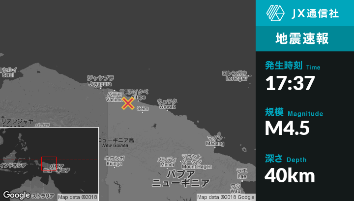 1月15日 17:37頃、パプアニューギニアのAitapeから西50kmの地点でM4.5の地震がありました。