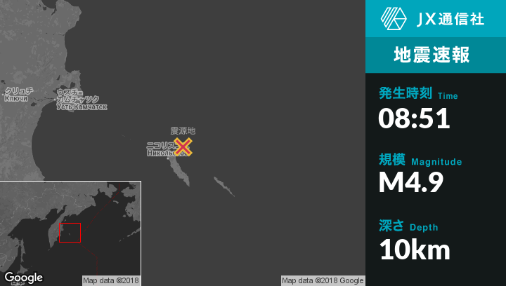 1月28日 08:51頃、ロシアのNikol'skoyeから北東43kmの地点でM4.9の地震がありました。